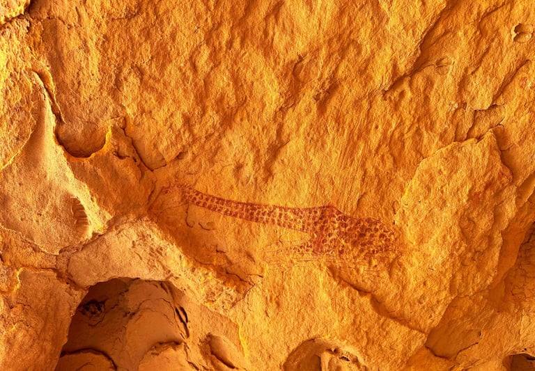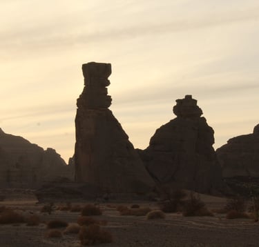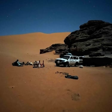 Accueil à l'aéroport et départ vers Tadrart passant sur l'abri de peintures de In-Djarran puis faire une pause de déjeuner à Innokssam, l'après-midi vers les gravures rupestres de Wan Ahar puis le canyon de Tin Abaden et les arches de Tehe Thossyat, bivouac dans les dunes de Moluannaga.