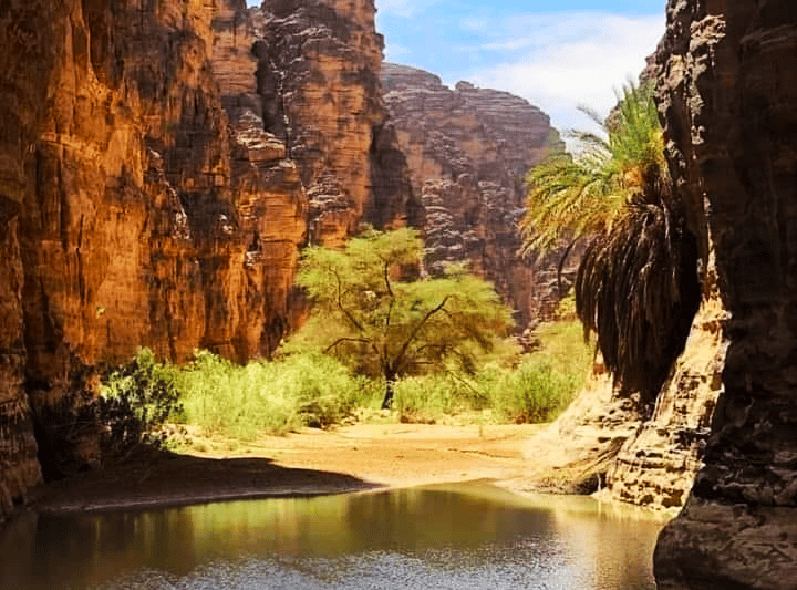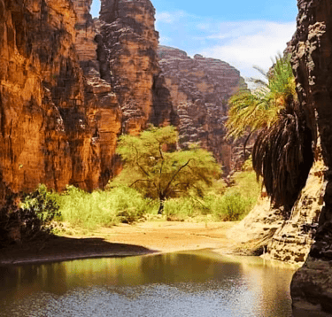 Nous dirigeons vers la vallée d'Essandilan passant près de dunes de l'erg Admer arrivons à Essendillene à midi faire une pause de déjeuner, l'après-midi faire une tour 02h entre l'aller et retour, à pied au long de canyon jusqu'au bout on trouve le magnifique étang Gelta puis retournons près de 4x4 pour diriger vers Tikadewen pour le bivouac.