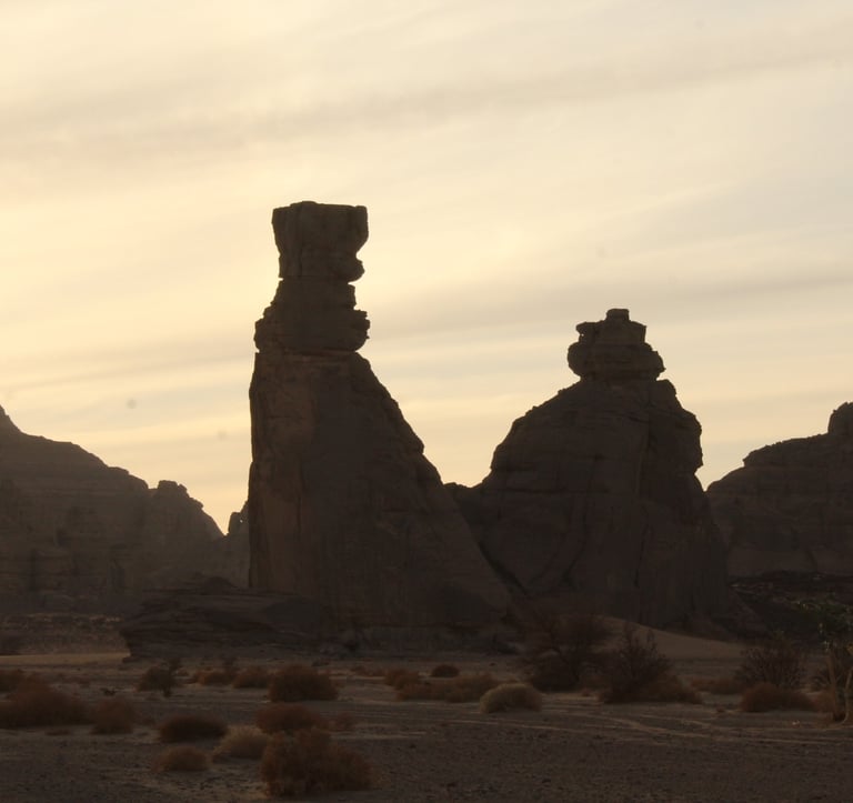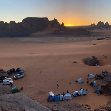 Accueil à l'aéroport, départ à Tadrart rouge passent sur Amaïs, Imaharhatan et Esseti puis arrivée à Elberdj et bivouac.