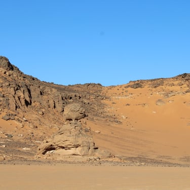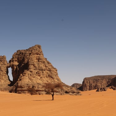 Démarrage de Timarzouga marchons à pied vers le rocher de la coupe du monde puis le grotte d'Essirke pour rejoindre l'équipe et déjeuner, l'après-midi nous visiterons les deux arches de In Tehak et le bivouac à In Ekachaker.
